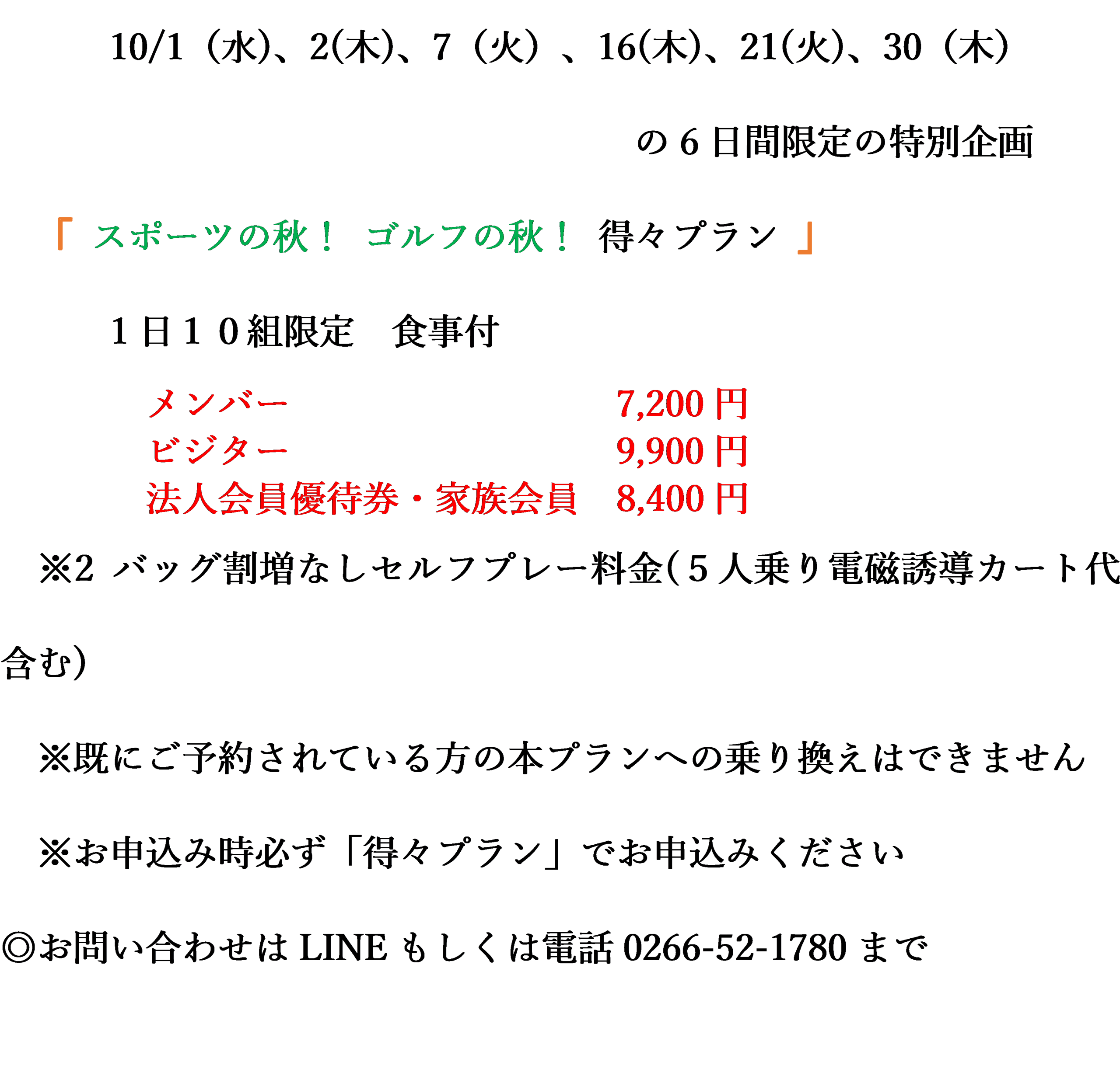 スポーツの秋!ゴルフの秋!得々プラン 10月日程のご案内
